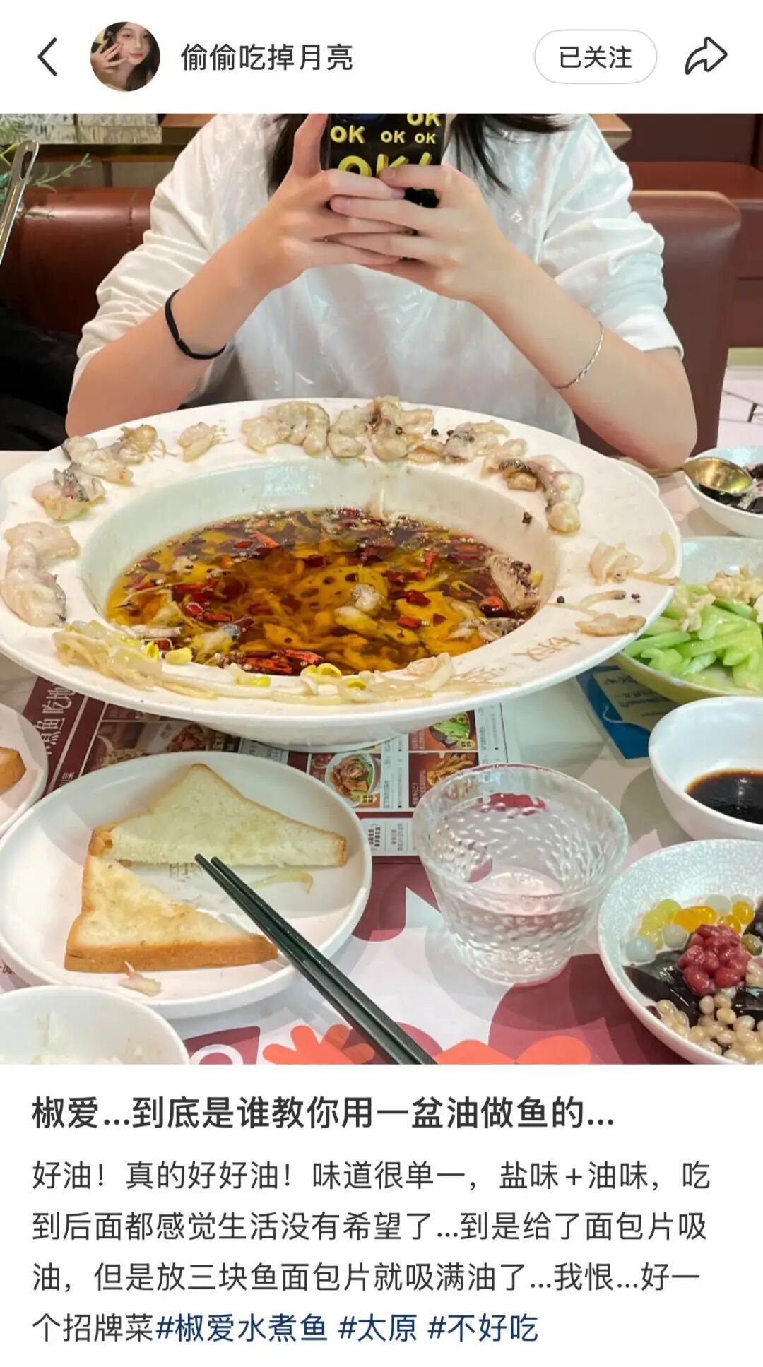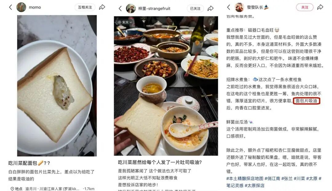 开在广东的川菜品牌渝月川·川渝江岸人家、渝月川菜,店员会主动提供用于吸油的面包片;太原俏江南门店中的招牌水煮鱼,也会专门搭配吸油吐司。