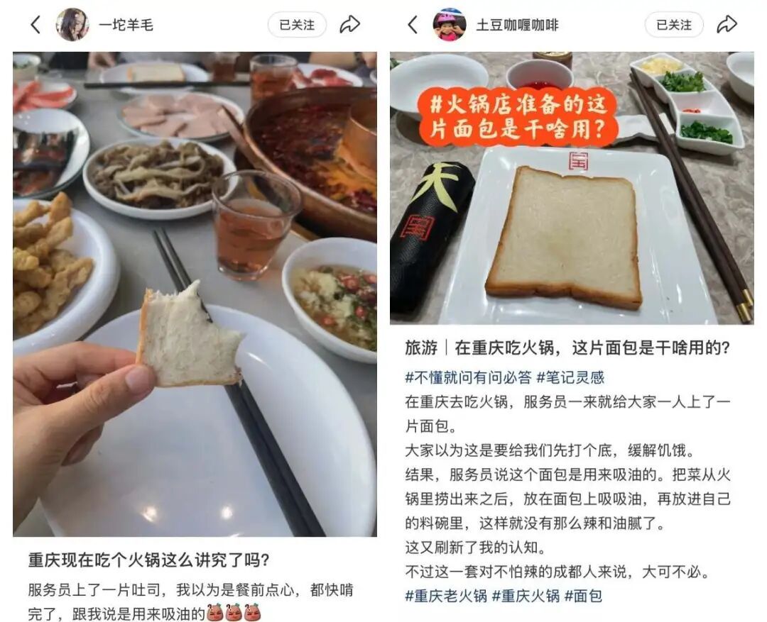 重庆的朝天门火锅、浪涂火锅等,吃菜前先将吸油面包片端上桌,被不明所以的消费者误认为是“餐前点心”。