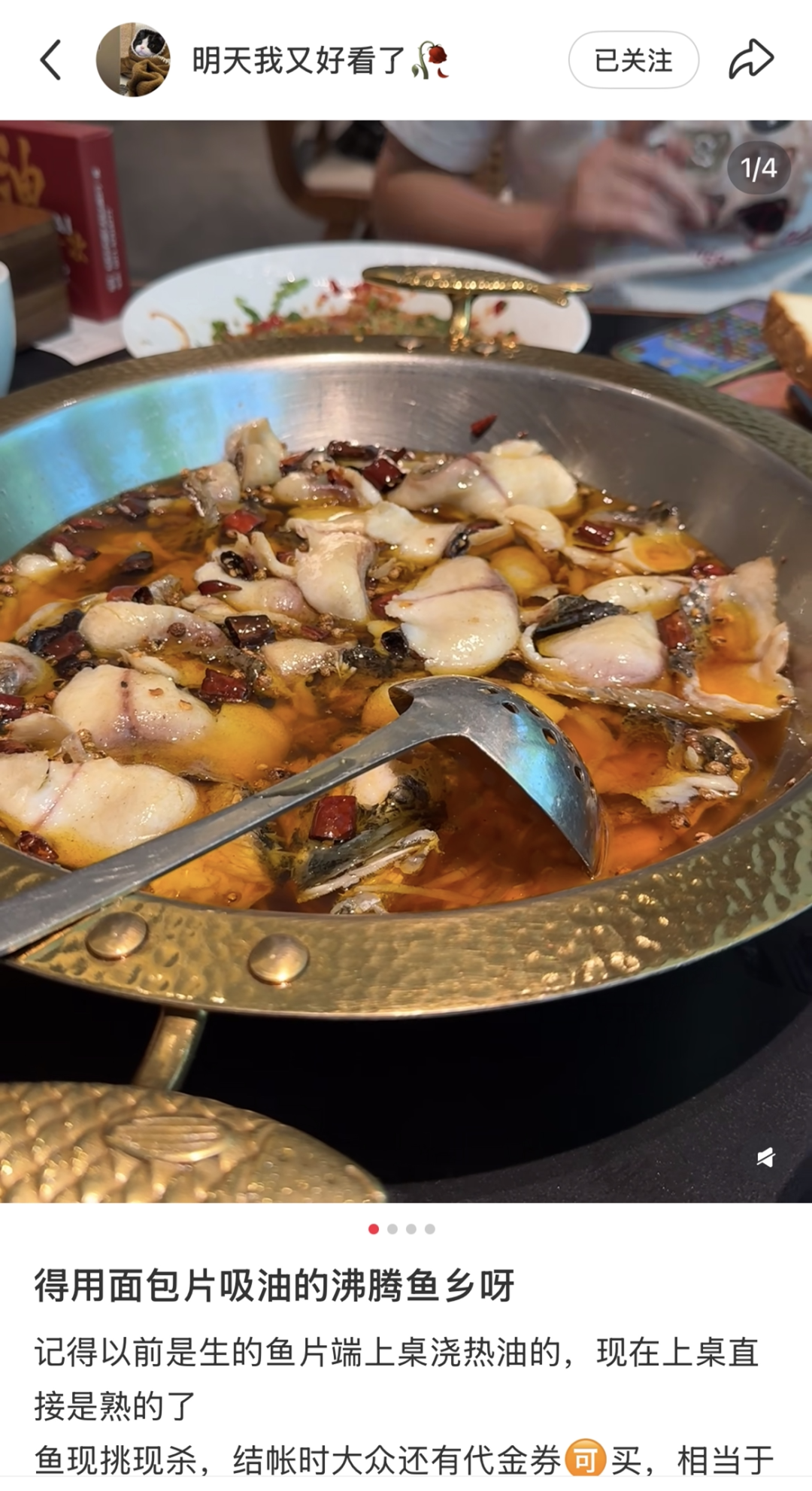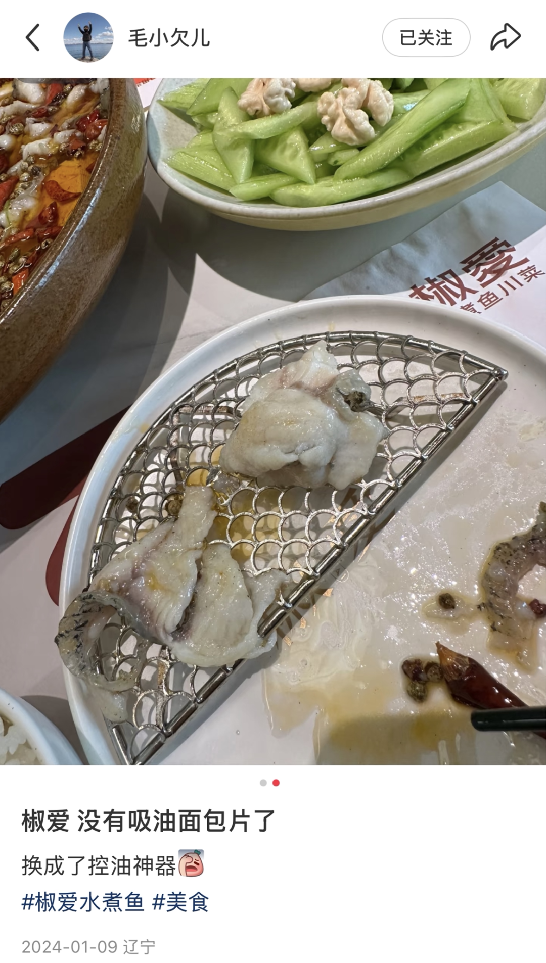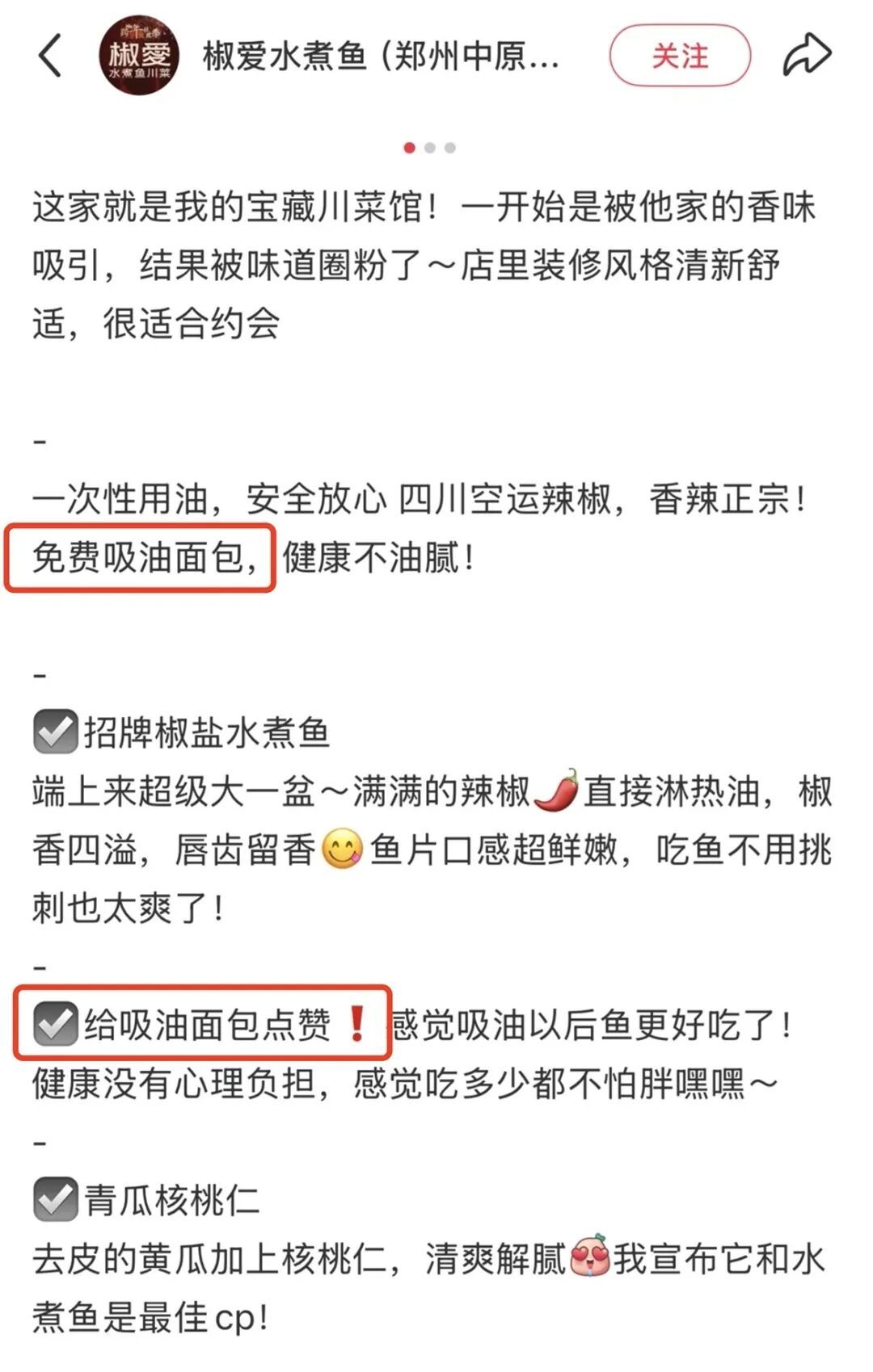 川菜品牌椒爱水煮鱼,把面包片当成水煮鱼的标志性搭配和宣传卖点,其某门店的官方账号就在文案中特意写明自家有“免费吸油面包”。