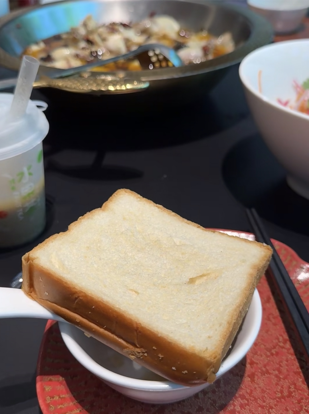 最近,有网友发现,去吃川菜时,服务员特意上了一片面包。